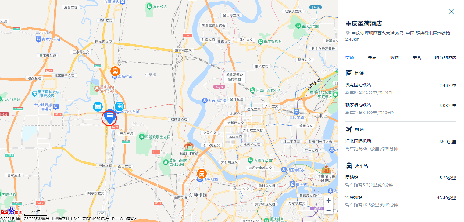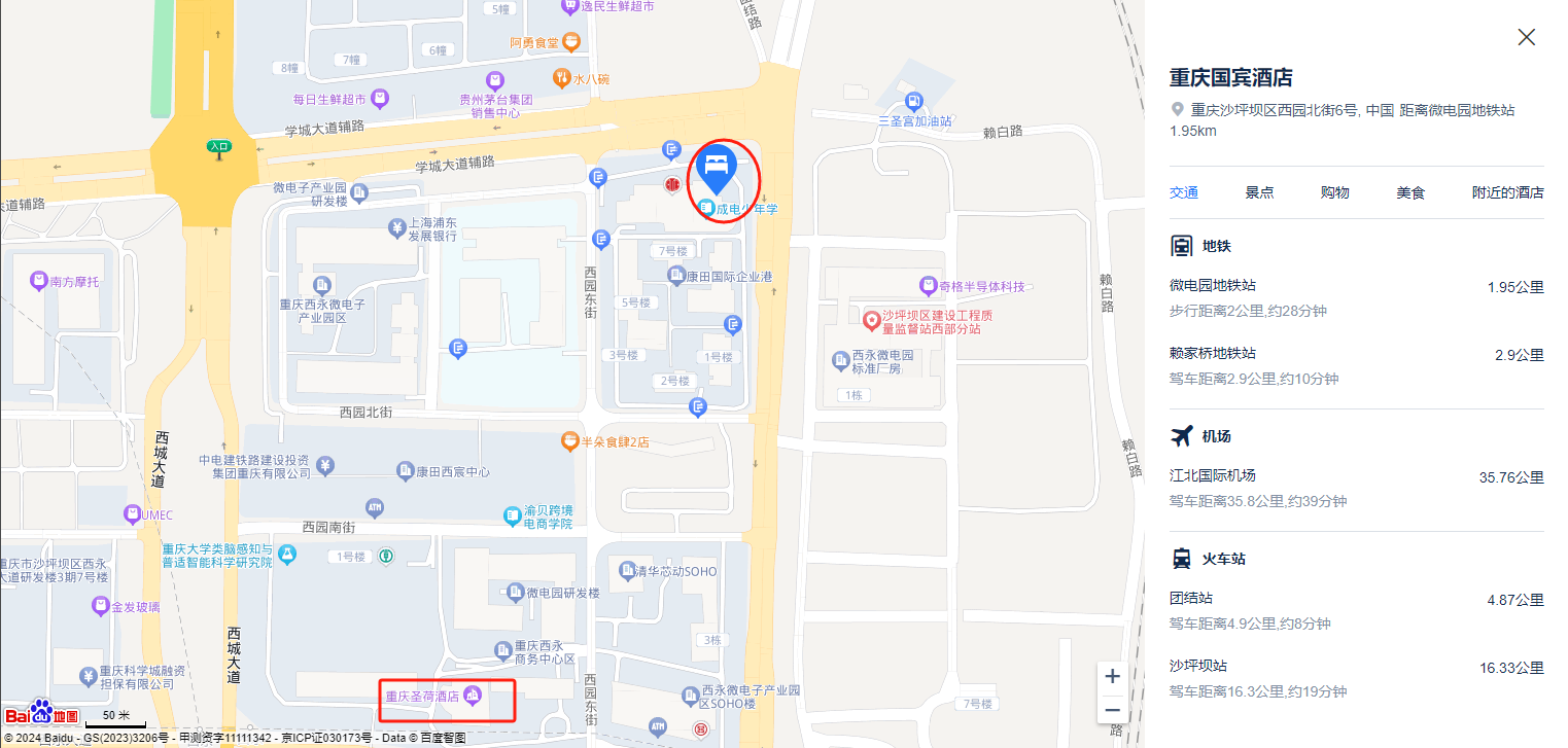 会议酒店:重庆国宾酒店(重庆市沙坪坝区西园北街6号), 距离会议酒店600米